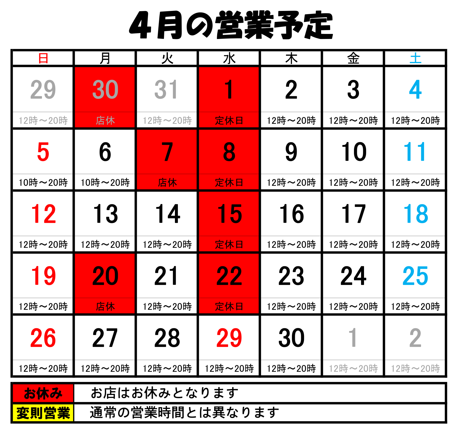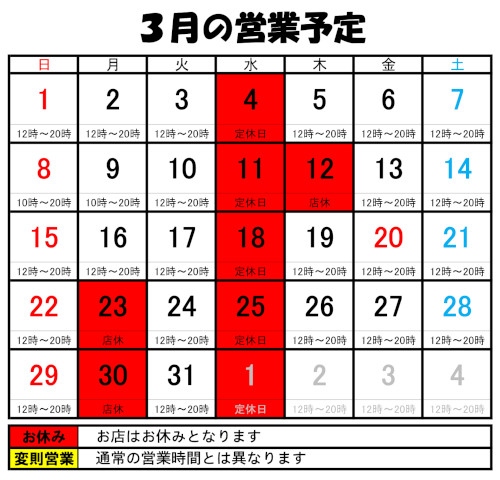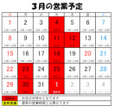 2026年3月の定休日カレンダーを更新しました。